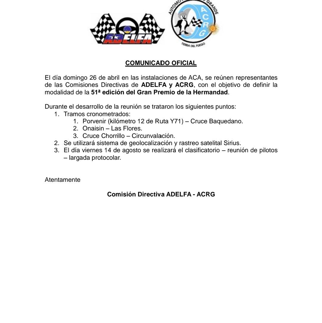Las comisiones directivas de ADELFA y el Automóvil Club Río Grande (ACRG) dieron a conocer un comunicado oficial con importantes definiciones sobre la 51ª edición del Gran Premio de la Hermandad, una de las competencias más emblemáticas del automovilismo patagónico.